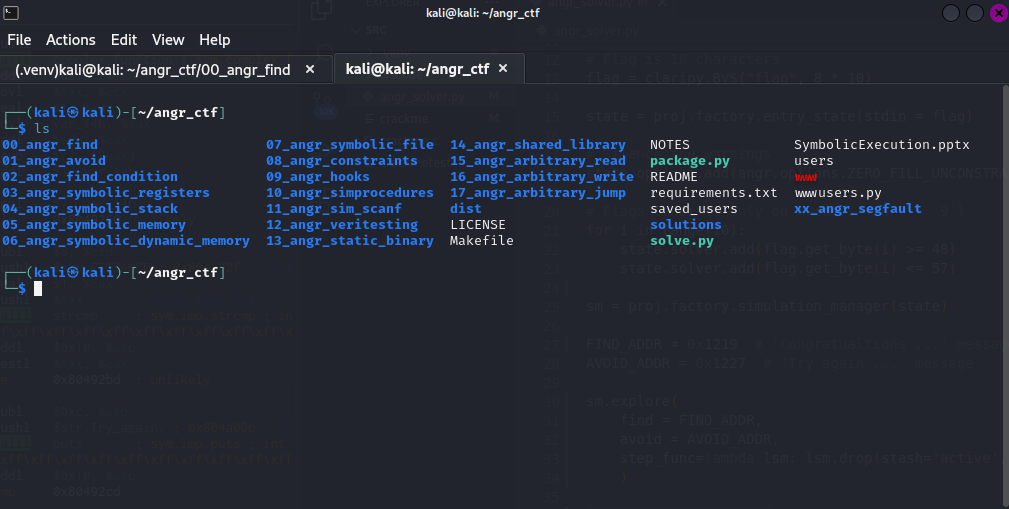 Symbolic execution in Angr is a powerful technique for analyzing binaries that treats every variable as a symbolic value and every decision point (branch) as a constraint. This approach allows the analysis to explore all possible execution paths through a program by systematically evaluating the impact of different values on the program’s behavior. Instead of running the program with actual inputs, symbolic execution uses symbolic inputs that stand for arbitrary values, akin to variables in algebra. This enables the exploration of all potential states the program can reach, depending on the input values, without having to execute the program concretely for each possibility.